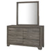 Complete your bedroom storage ensemble with the roomy space in this transitional six-drawer dresser with a framed mirror that attaches directly to the back of the dresser. It boasts a brown oak wood grain finish over laminate surfaces, creating a stylish look that resists everyday wear and tear. The dresser delivers roomy storage in drawer with smooth metal glides and bar pulls, adding the perfect hint of contrast and depth. Mitered trim adorns the front of the case and complements the frame on the mirror to create a sense of angular precision. Use the wide top for a jewelry box and a vase of flowers, or select decor that brings personalized aesthetics to your inviting bedroom. Key Features: • Crisp style enhances the clean lines of a transitional six-drawer dresser with a framed mirror • A brown oak wood grain finish is complemented with metal bar handles that add a touch of contrast • Six drawers create ample storage for clothing, accessories, and personal items in your bedroom • Made from engineered wood with laminate surfaces that resist scratches and dents • Drawers feature center metal extension glides for seamless performance and operation