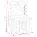Every woman's dream lies right here in the Amia Vanity Set, the dressing table with a Hollywood mirror. Constructed of manufactured woods, it gives a symmetrical silhouette. Finished in a beautiful, glossy white color. The Amia 2pc Vanity Set includes mirror and multiple drawers for storage. The Amia vanity set also includes one power outlet, making it ideal for touching up your hair or even working on your laptop. Features: • 4mm Mirror • Edge to Edge Glass Top • 7 Spacious Drawers for Adequate Storage • 1 Spacious Cabinet • Stylish, Clear Knobs • Includes One Power Outlet • Assembly Required Dimensions: Depth: 18.0" x Width: 47.0" x Height: 66.0" Weight: 138.0 lbs.