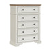 Create an inviting sanctuary with the beautifully crafted Eastwood collection that exudes timeless charm and elegance. The two-tone design with rich brown top adds depth and sophistication to this case piece. Experience practicality with a felt-lined top drawer for delicate items, smooth ball-bearing drawer guides, and durable French dovetail construction. With added safety from an anti-tipping kit, this chest from the Eastwood collection blends intricate detail, functionality, and durability for an enchanting bedroom experience. Features: • Antique White Color Gives a Timeless, Classic Appeal • Two-Tone Piece with Brown Top Creates Rich Contrast • Protective Layer of Black Felt in Top Drawer • Smooth Operation with Ball Bearing Drawer Guide System • French Dovetail Drawer Construction to Withstand Daily Use • Anti Tipping Kit Included to Secure to Wall • 35"W x 16"D x 48"H • Due to Lighting, Color May Slightly Vary From Images Dimensions: Depth: 16.0" x Width: 35.0" x Height: 48.0" Weight: 138.0 lbs.